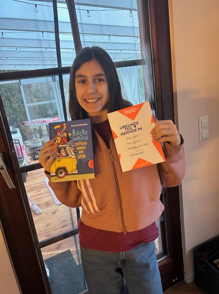 Besonders spannend war der Fremdtext. Ich musste nämlich als Erste aus der zweiten Gruppe vorlesen. Das hat mich noch nervöser gemacht, weil ich nicht wusste, was für ein Text mich erwartet. Am Ende hat sich die ganze Aufregung aber gelohnt: Ich habe den 3. Platz gemacht! Darüber habe ich mich riesig gefreut und war auch ein bisschen stolz auf mich. Es war eine aufregende und tolle Erfahrung, die ich bestimmt nie vergessen werde.